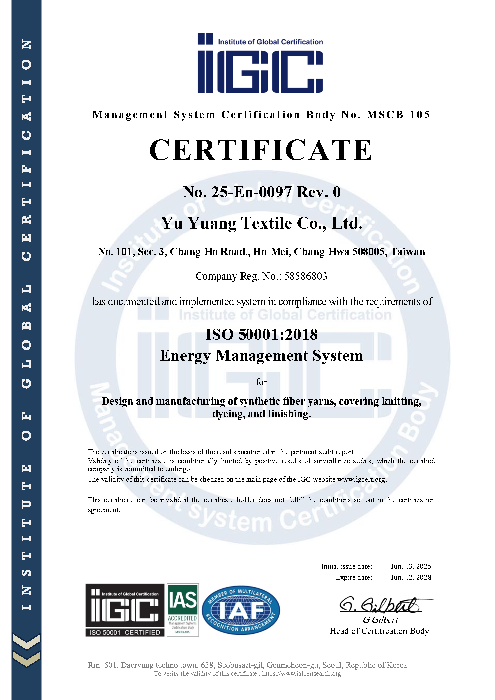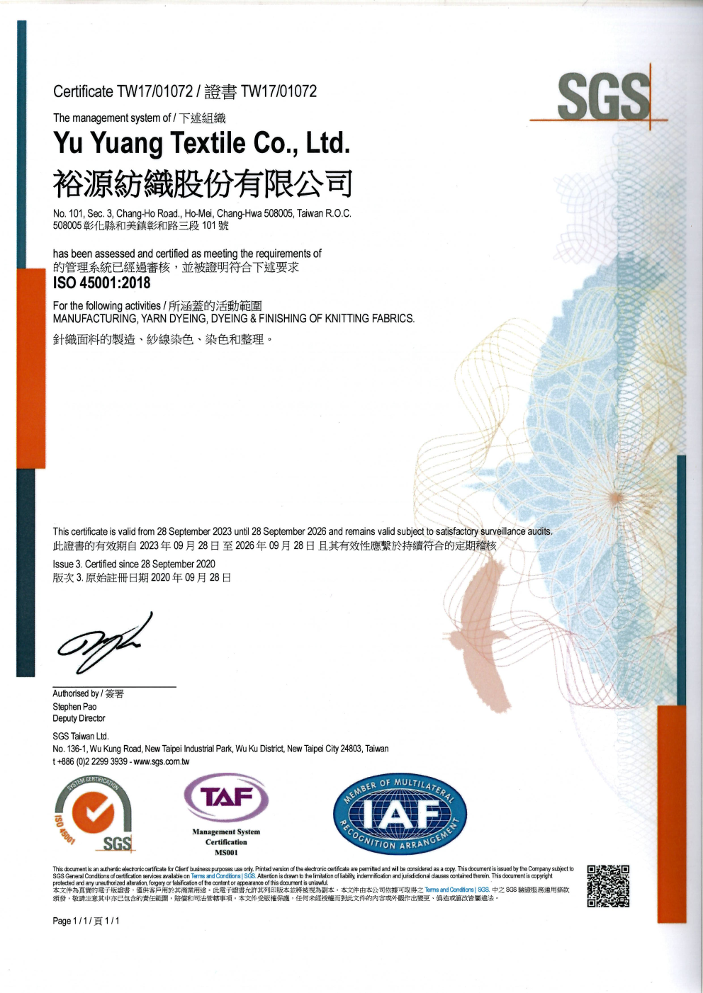 Yu Yuang is a textile enterprise engaged in the vertical operation of weaving, dyeing, and finishing. Ever since its establishment, Yu Yuang realized that the employees and the suppliers are vital assets for the sustainable development of the Company. As such, Yu Yuang duly observes applicable laws in labor health and safety as well as other requirements in the process of research and development, manufacturing, testing, and sale. In addition, Yu Yuang makes tireless efforts in making labor health and safety perfect to avoid any behaviors that may jeopardize safety, the environment, and equipment, and seeks to prevent occupational hazards and perform its responsible for the protection of the health and safety of its employees to its entirety.